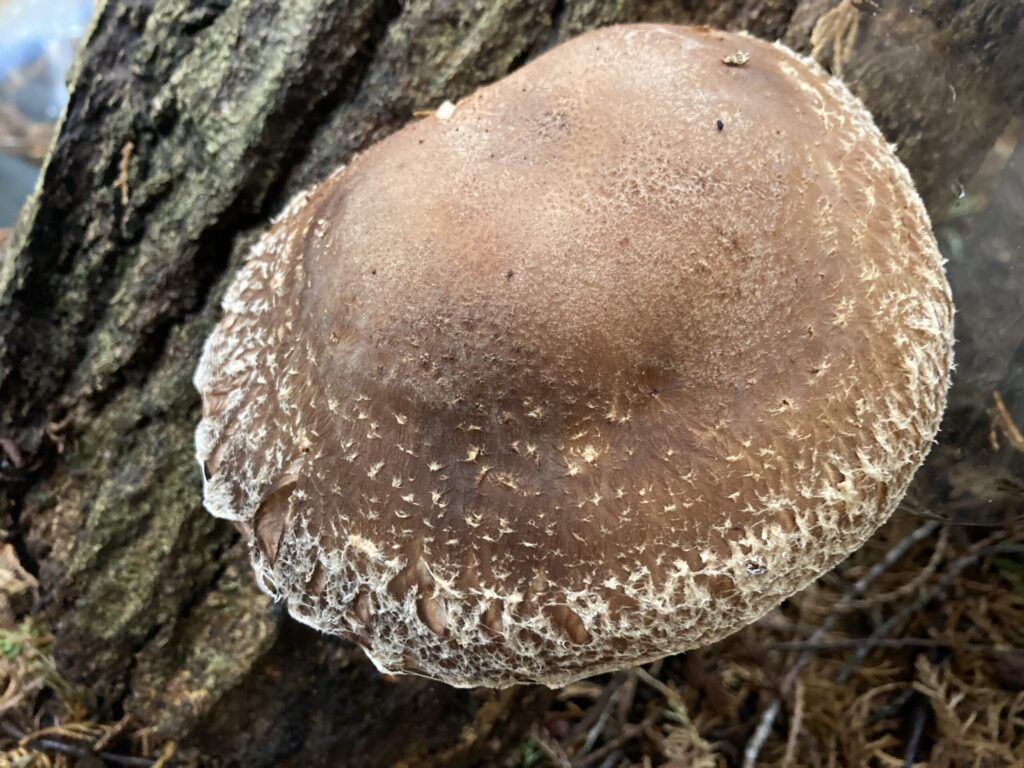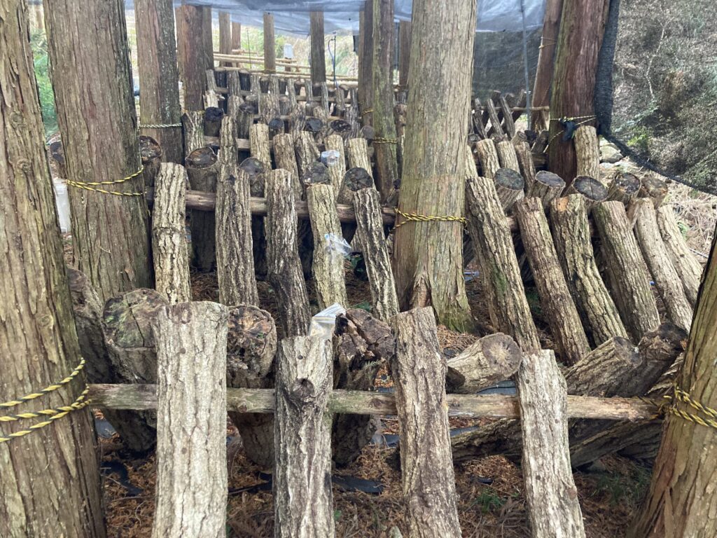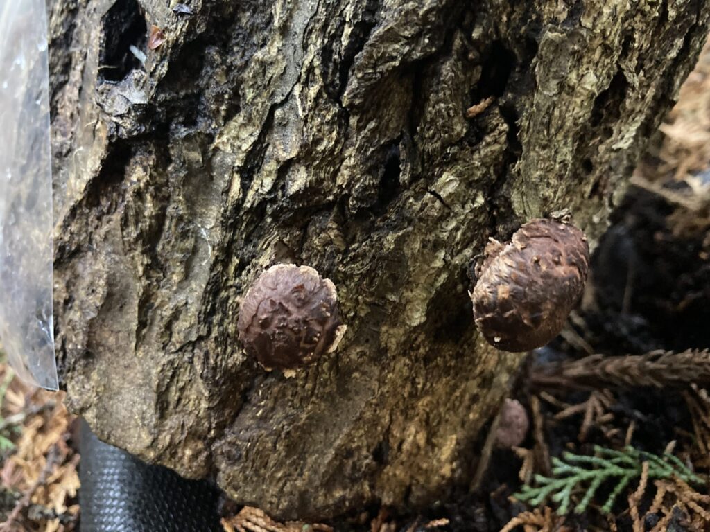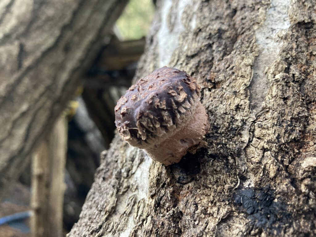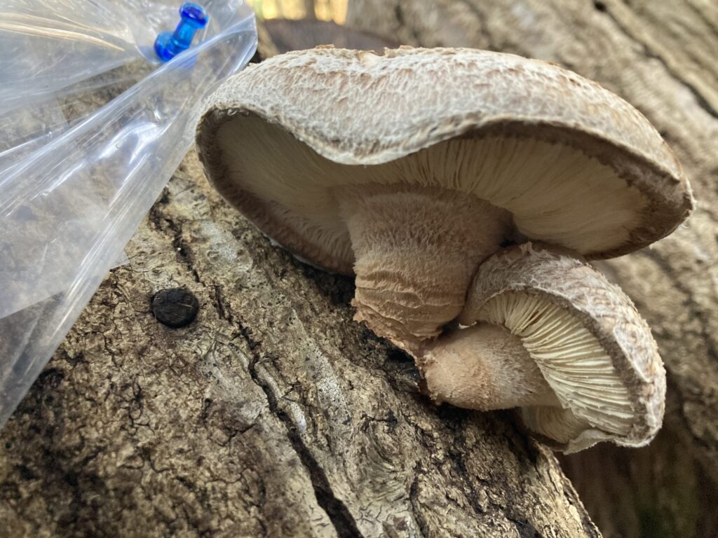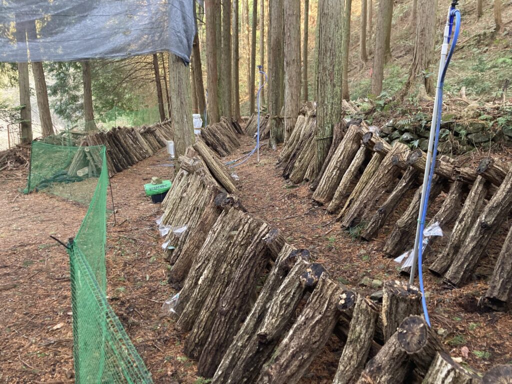 写真でお分かりだと思いますが(撮影時のみ外しています)、ある程度成長した段階で、専用のナイロン袋の一片を切断して袋掛けしています。理由は傘に雨や散水が当たらないように高品質な原木椎茸を栽培するためです。