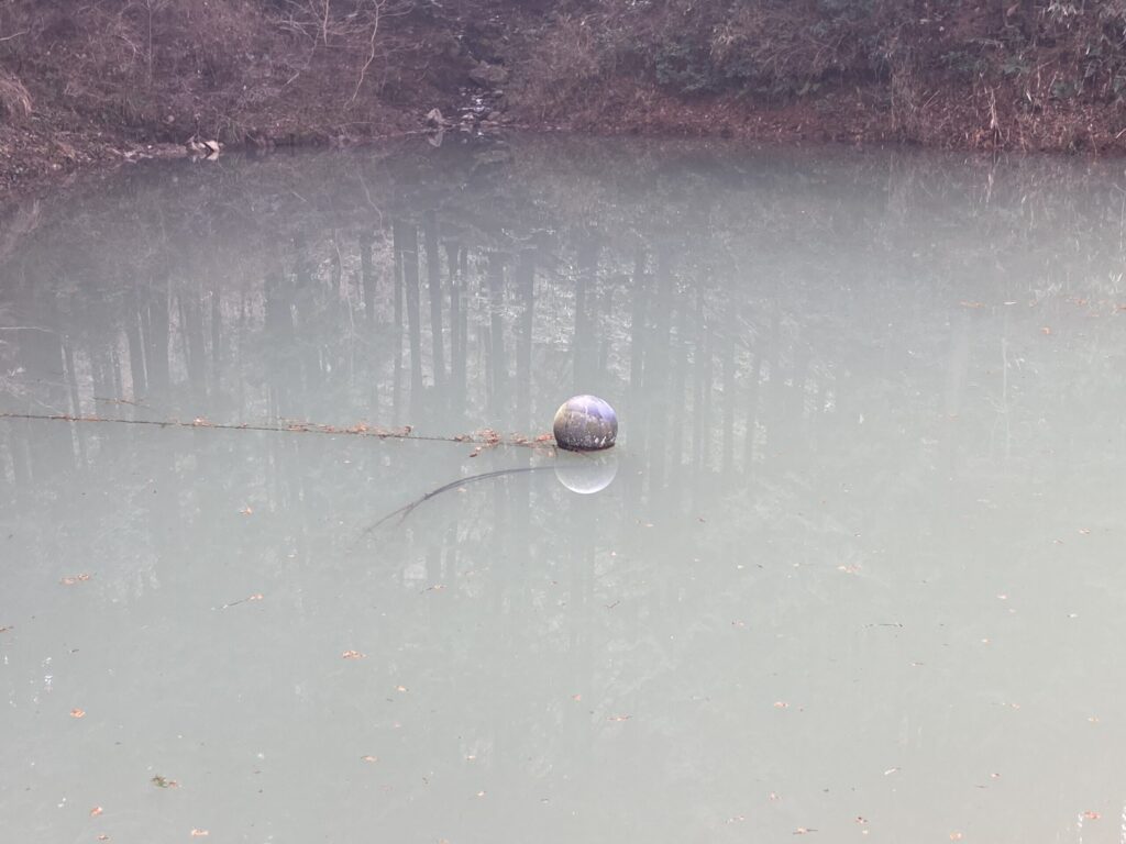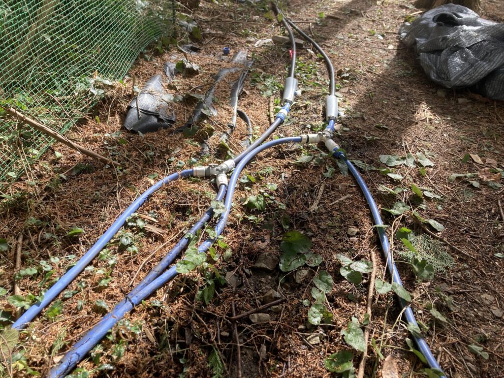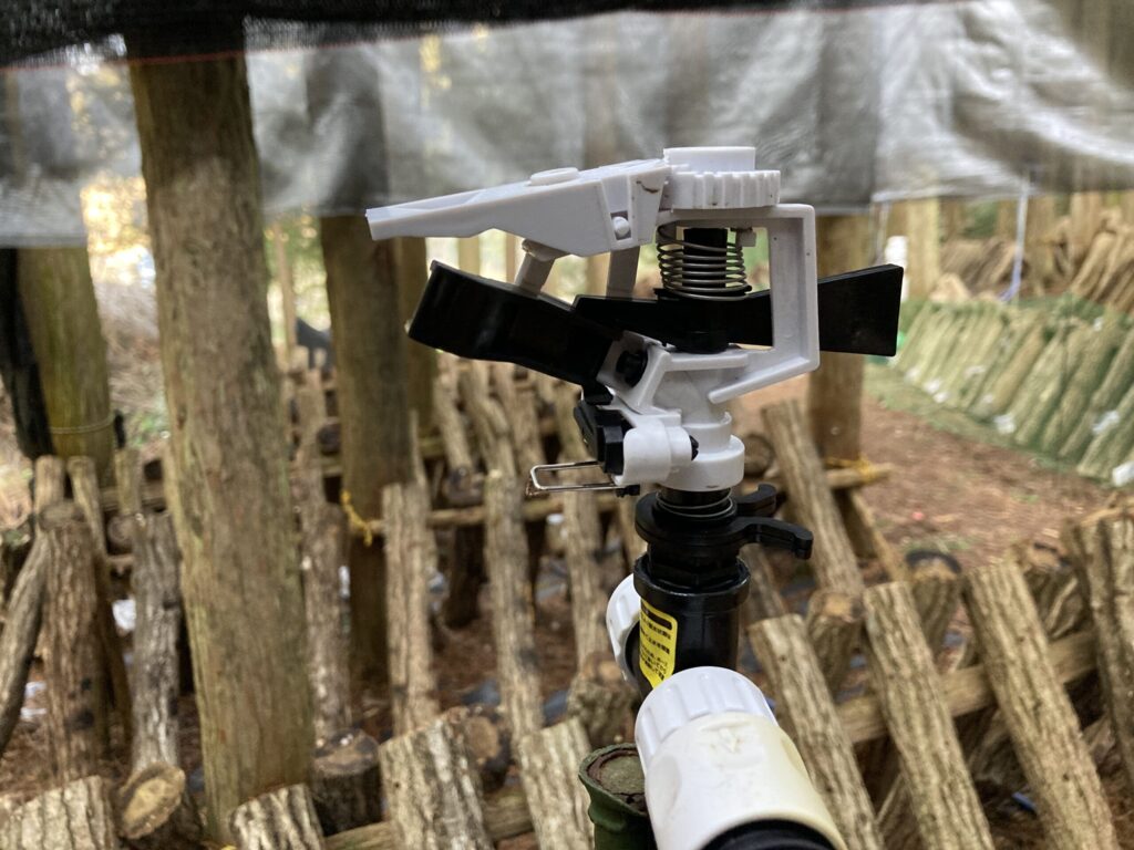 水は上部のため池から約100mサイホン方式で給水管内径13mm2本で供給しています。スプリンクラーは全部で8基設置しています。1月~2月中旬は給水管内凍結により散水できませんでした。