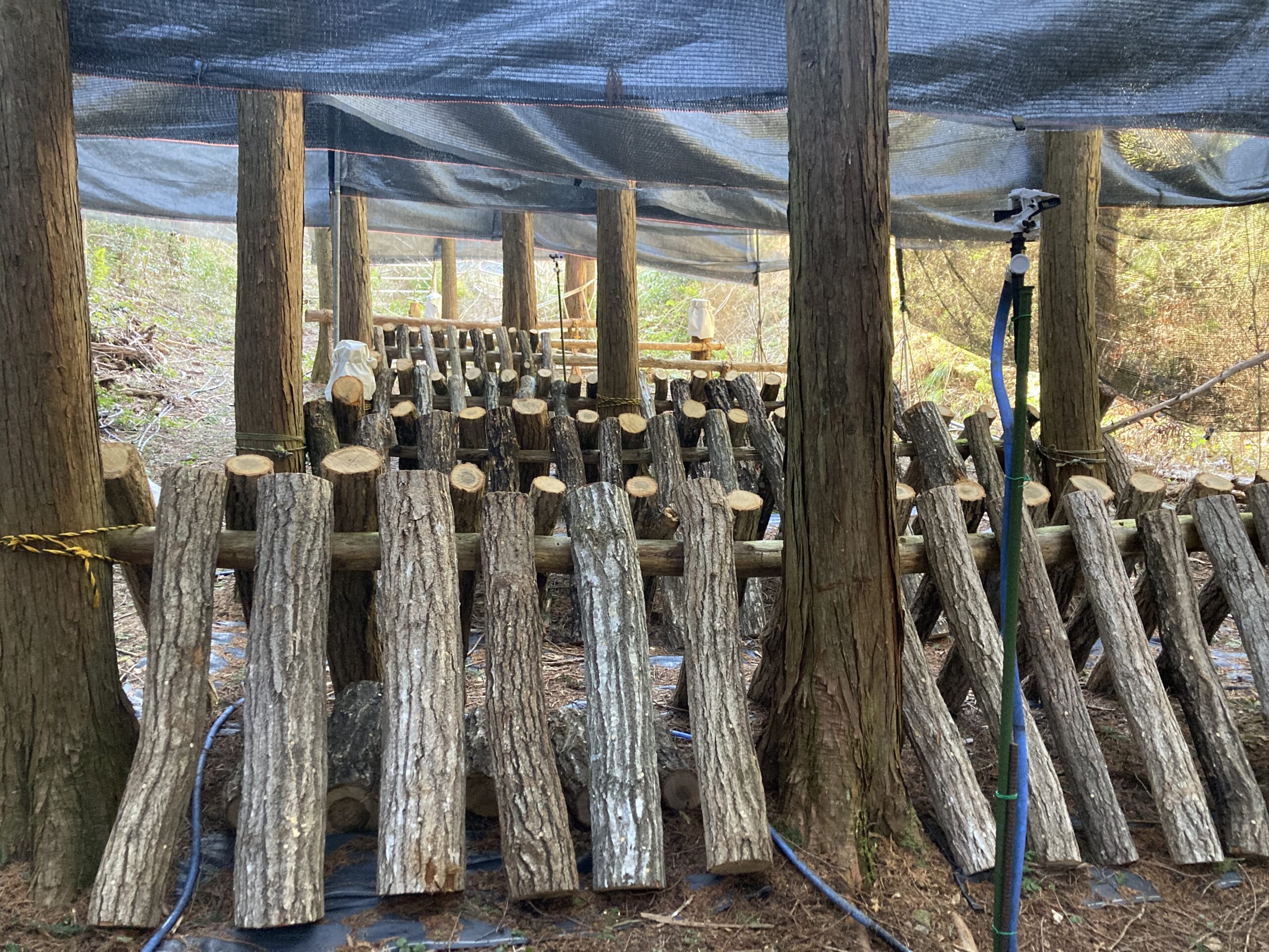 露地による原木椎茸栽培は今年で25年目を迎えましたが、小雨により乾燥が影響して近年で劇的に厳しい状況です。傘の直径5cmに満たない椎茸が水分不足で成長が止まり乾燥して大半が干し椎茸になってしまいました。 水は上部のため池…